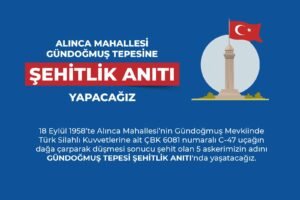 ✅ 18 Eylül 1958’te Alınca Mahallesi’nin Gündoğmuş Mevkiinde Türk Silahlı Kuvvetlerine ait ÇBK 6081 numaralı C-47 uçağın dağa çarparak düşmesi sonucu şehit olan 5 askerimizin adını Gündoğmuş Tepesi Şehitlik Anıtında yaşatacağız.