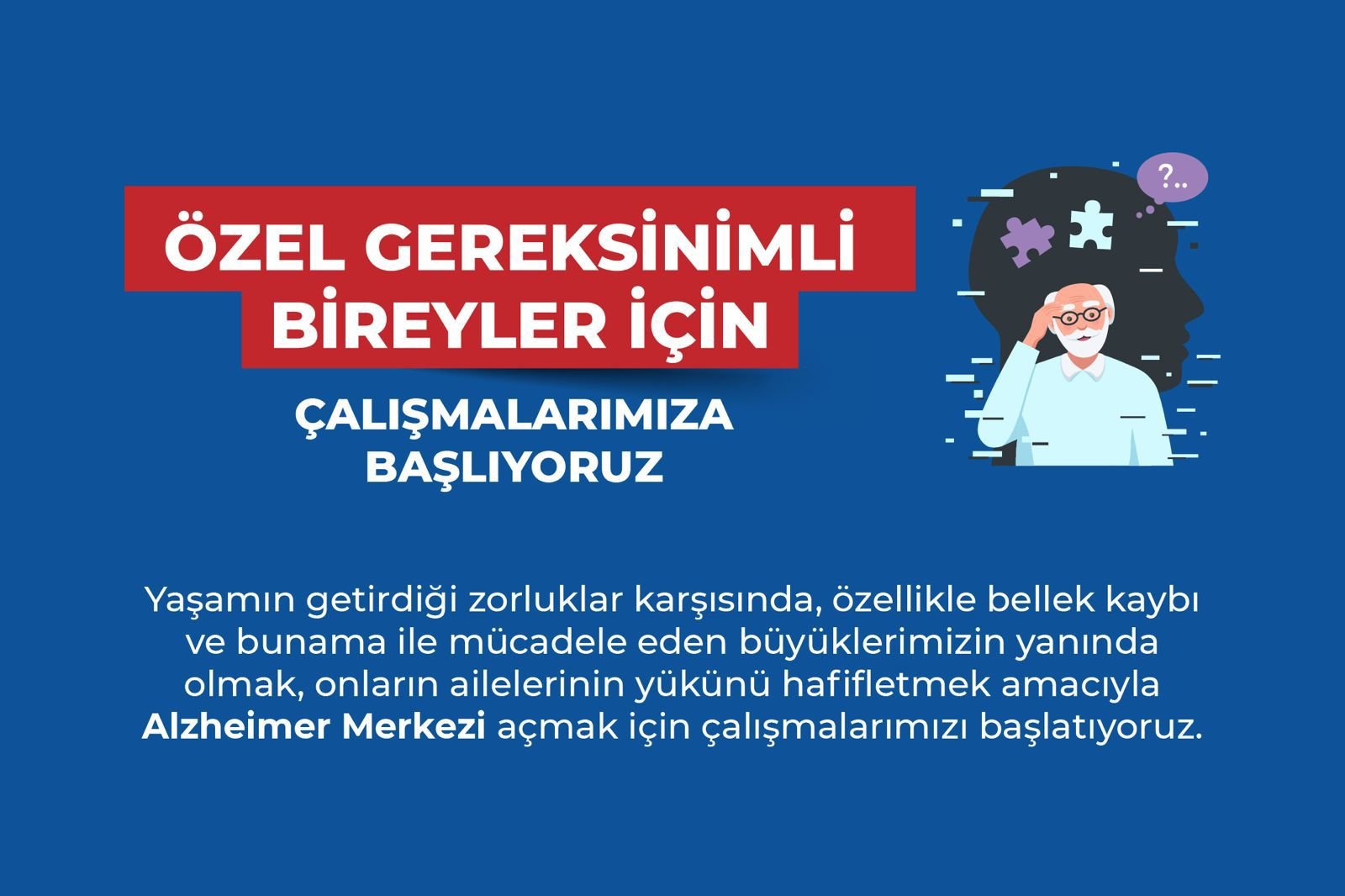 ✅ Yaşamın getirdiği zorluklar karşısında, özellikle bellek kaybı ve bunama ile mücadele eden büyüklerimizin yanında olmak, onların ailelerinin yükünü hafifletmek amacıyla Alzheimer Merkezi açmak için çalışmalarımızı başlatıyoruz.