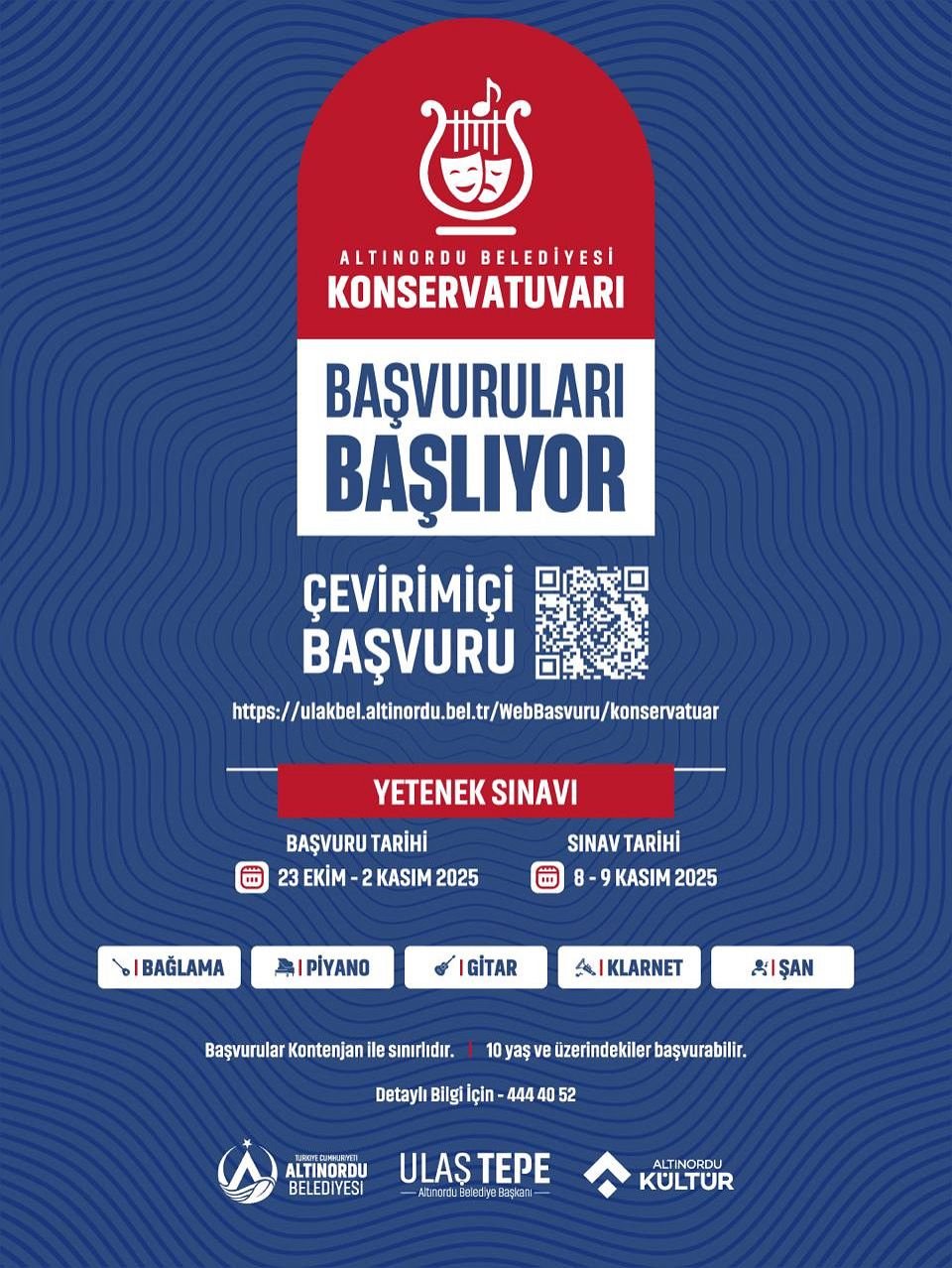 Ekim Ayı Olağan Meclis Toplantısında kuruluşu onaylanan Altınordu Belediyesi Konservatuvarı’nda eğitim faaliyetleri başlıyor. Altınordu Belediye Başkanı Ulaş Tepe, “2025-2026 Eğitim Öğretim Yılı faaliyetleri doğrultusunda konservatuvarımıza başvurular başladı. Kentimizin kültür ve sanat yaşamına katkı sağlayacak yeni kurumumuzun hayırlı uğurlu olmasını diliyorum. Geleceğin sanatçılarını konservatuvarımıza davet ediyoruz” dedi.