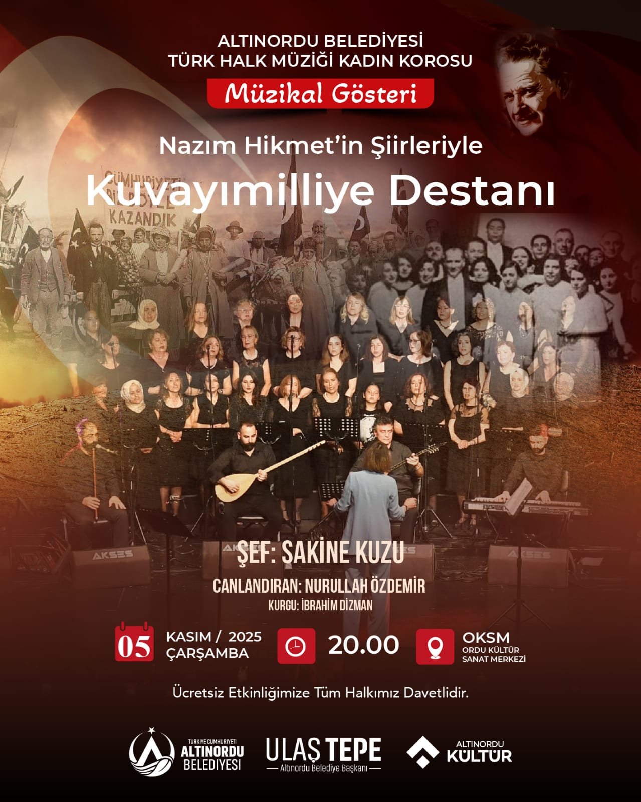 Altınordu Belediyesi Türk Halk Müziği Kadın Korosu, “Nazım Hikmet’in Şiirleriyle Kuvayımilliye Destanı” adlı müzikal gösteriyi sanatseverlerle buluşturacak.