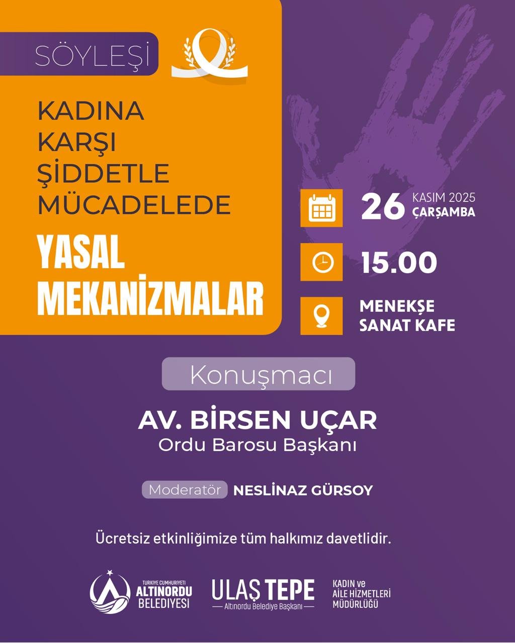 Altınordu Belediyesi, Kadına Yönelik Şiddete Karşı Uluslararası Mücadele Günü kapsamında 26 Kasım Çarşamba günü saat 15.00’te Sanat Kafe’de, ‘Kadına Karşı Şiddetle Mücadele Yasal Mekanizmalar’ konulu söyleşi düzenleyecek. Söyleşiye Ordu Barosu Başkanı Av. Birsen Uçar konuşmacı olarak katılacak.